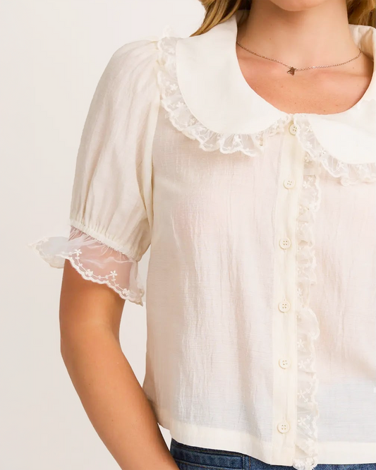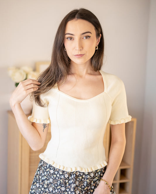 Elan Square Neck Half Sleeve Ruffle Ribbed Top in Buttercream